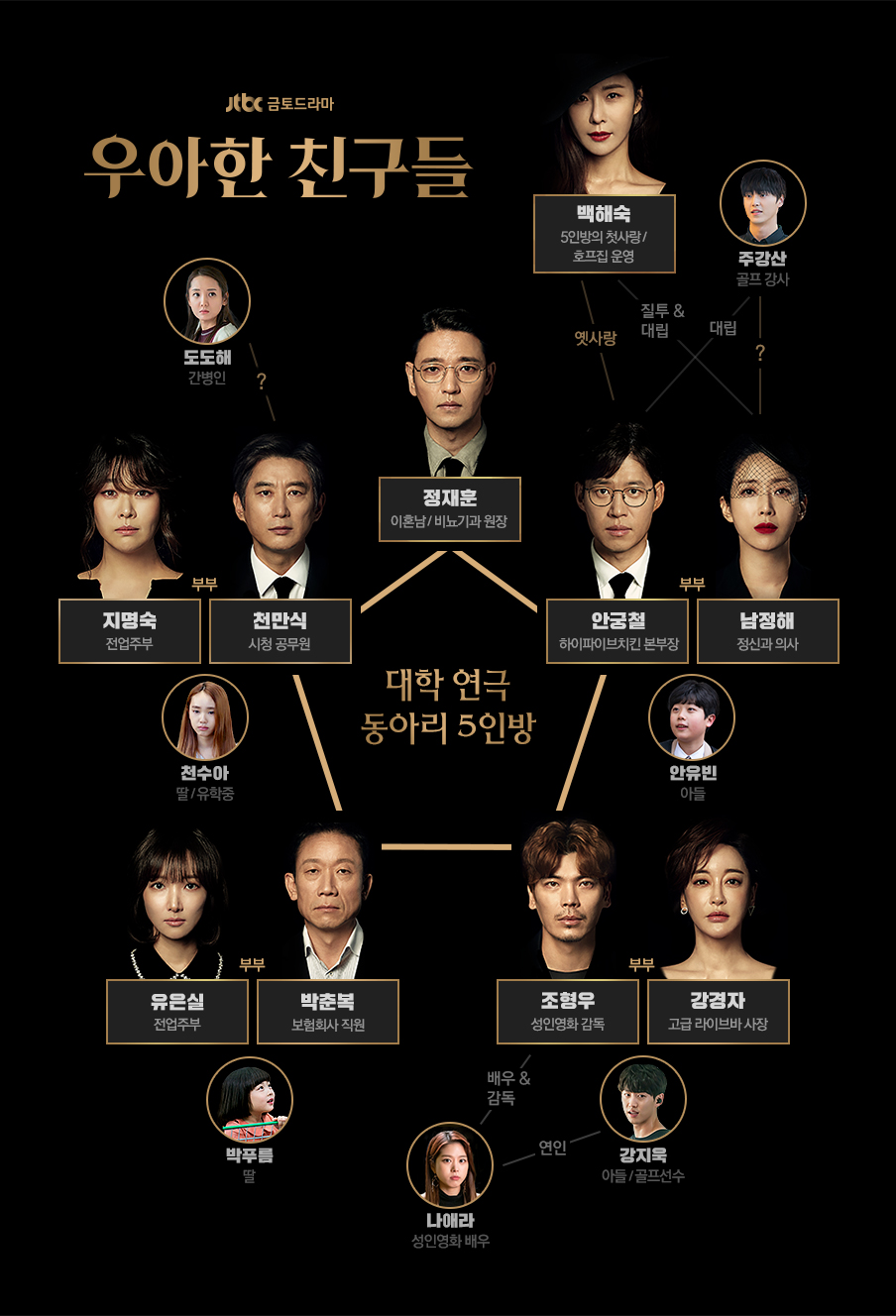 오랜만에 정말 재밌는 드라마를 발견했다. 이 드라마를 왜 이제야 보게 됐을까? 하는 생각이 드는 드라마이다. 많은 사람들이 보기를 추천하는 정말 재밌는 드라마 "우아한 친구들"이다. 드라마 우아한 친구들은 2020년 7월부터 9월까지 17부작 작품으로 jtbc에서 초호화 케스팅 드라마라고 할 수 있다. 전개가 매우 복잡하기 때문에 간추려 보기 만으로 드라마 전체 내용을 이해하기는 상당히 어려운 스토리를 가지고 있다고 할 수 있다. 그럼에도 불구하고 시청자들이 이 드라마를 좋아했던 이유는, 한국 드라마라고 믿기 어려울 정도의 자극적인 소재를 자극적이지 않게 표현하면서도, 흥미롭게 그려냈기 때문인 것 같다.